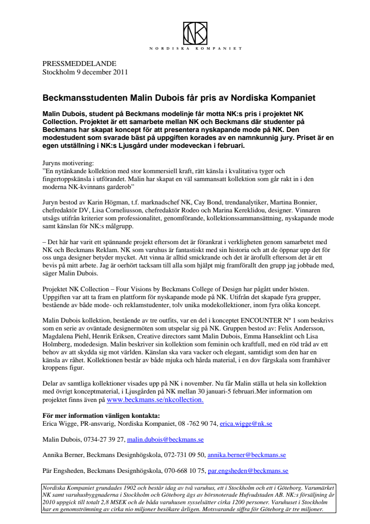 Malin Dubois, student på Beckmans modelinje får motta NK:s pris i projektet NK Collection. Projektet är ett samarbete mellan NK och Beckmans där studenter på Beckmans har skapat koncept för att presentera nyskapande mode på NK. Den modestudent som svarade bäst på uppgiften korades av en namnkunnig jury på onsdagen. Priset är en egen utställning i NK:s Ljusgård under modeveckan i februari.