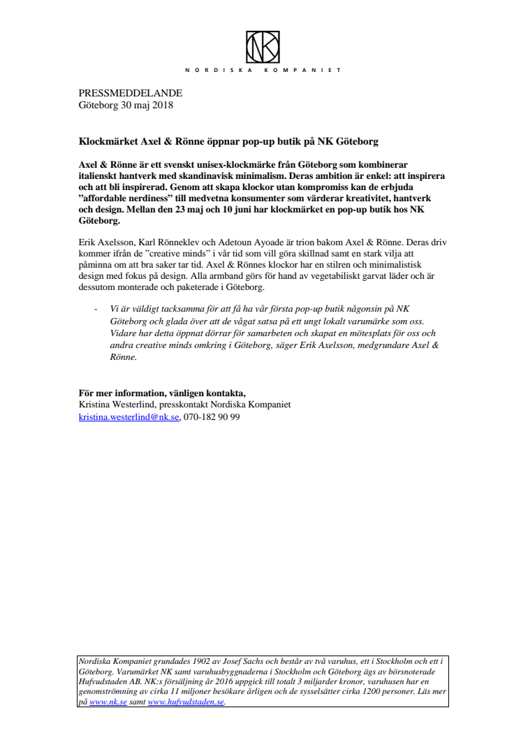 Klockmärket Axel & Rönne öppnar pop-up butik på NK Göteborg