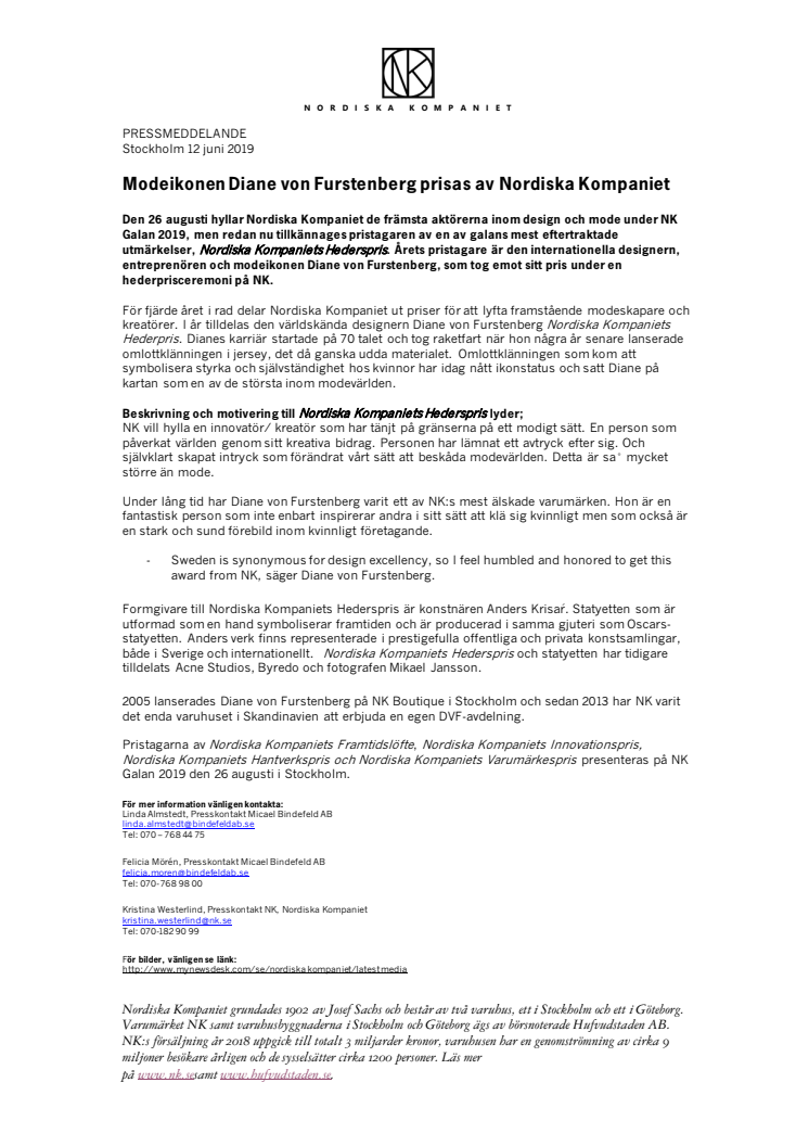 Den 26 augusti hyllar Nordiska Kompaniet de främsta aktörerna inom design och mode under NK Galan 2019, men redan nu tillkännages pristagaren av en av galans mest eftertraktade utmärkelser, Nordiska Kompaniets Hederspris. Årets pristagare är den internationella designern, entreprenören och modeikonen Diane von Furstenberg, som tog emot sitt pris under en hedersprisceremoni på NK.