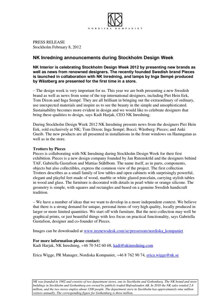 NK Inredning announcements during Stockholm Design Week.