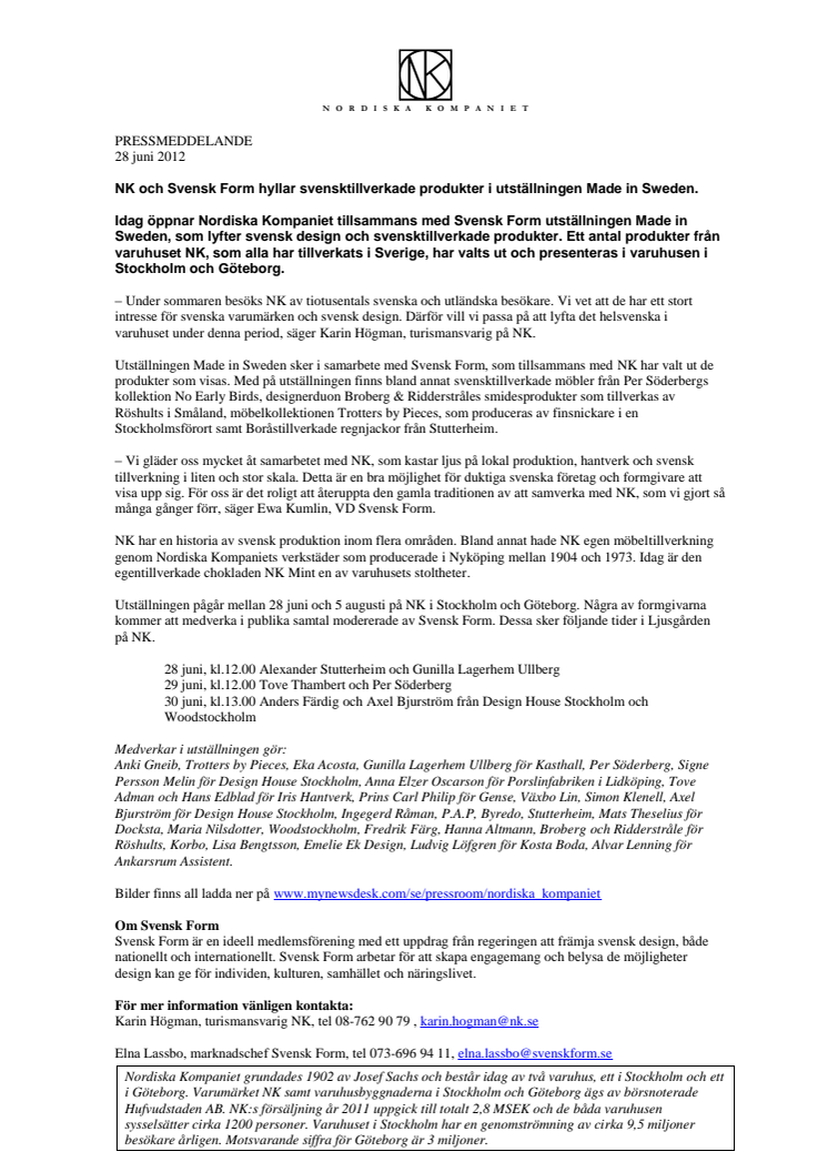 Idag öppnar Nordiska Kompaniet tillsammans med Svensk Form utställningen Made in Sweden, som lyfter svensk design och svensktillverkade produkter. Ett antal produkter från varuhuset NK, som alla har tillverkats i Sverige, har valts ut och presenteras i varuhusen i Stockholm och Göteborg.