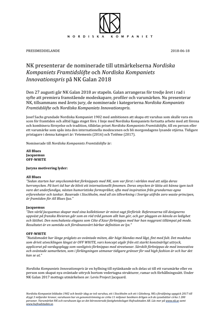 Den 27 augusti går NK Galan 2018 av stapeln. Galan arrangeras för tredje året i rad i syfte att premiera framstående modeskapare, profiler och varumärken. Nu presenterar NK, tillsammans med årets jury, de nominerade i kategorierna Nordiska Kompaniets Framtidslöfte och Nordiska Kompaniets Innovationspris.