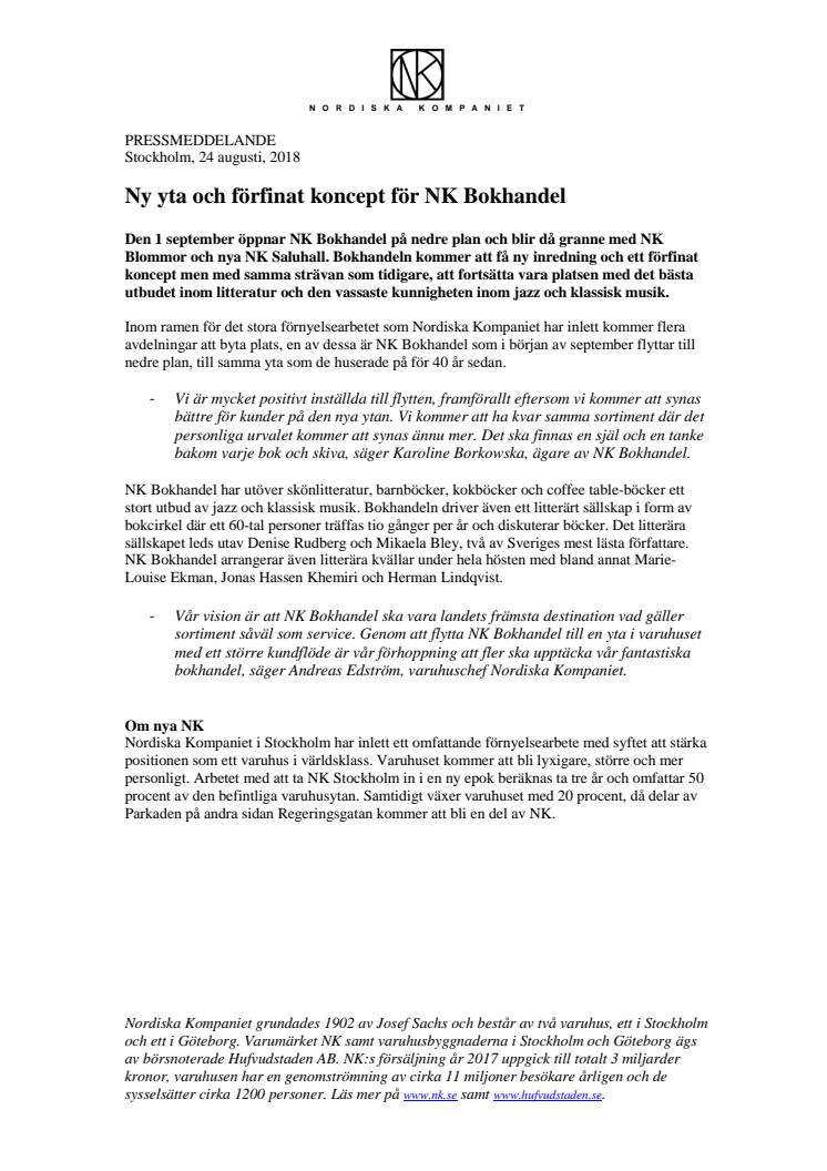 Den 1 september öppnar NK Bokhandel på nedre plan och blir då granne med NK Blommor och nya NK Saluhall. Bokhandeln kommer att få ny inredning och ett förfinat koncept men med samma strävan som tidigare, att fortsätta vara platsen med det bästa utbudet inom litteratur och den vassaste kunnigheten inom jazz och klassisk musik.