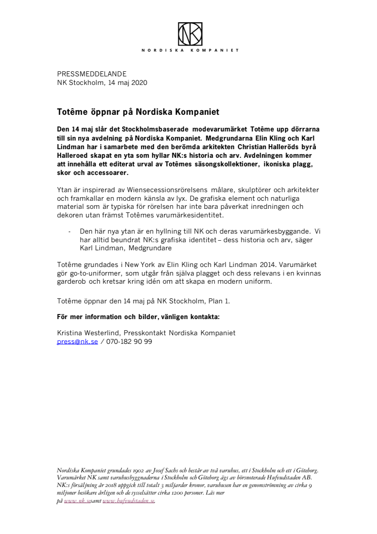 Den 14 maj slår det Stockholmsbaserade modevarumärket Totême upp dörrarna till sin nya avdelning på Nordiska Kompaniet. Medgrundarna Elin Kling och Karl Lindman har i samarbete med den berömda arkitekten Christian Halleröd skapat en yta som hyllar NK:s historia och arv. Avdelningen kommer att innehålla ett editerat urval av Totêmes säsongskollektioner, ikoniska plagg, skor och accessoarer.