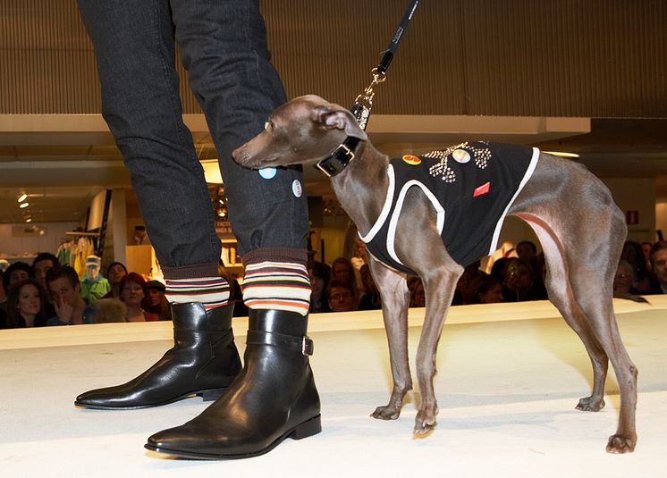 Evios i halsband och tröja från Doggidog NK Details. Husse i skor från Rizzo NK Skor & Accessoarer, strumpor från Paul Smith NN Herrtrend.