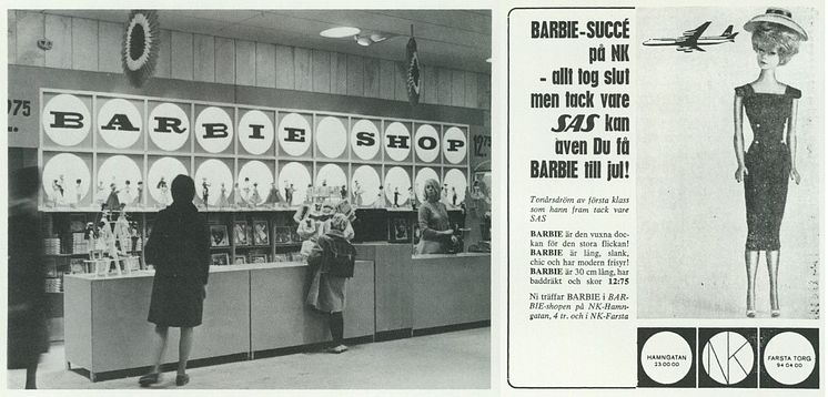 För NK har Barbie alltid varit en stor sak även om den ikoniska dockan just nu, av skäl som inte undgått någon, är lite extra i rampljuset världen över. Redan i oktober 1963 började NK sälja Barbiedockan i sina varuhus och hade genom dåvarande chefen för NK Leksaker, Carsten Bratt under en resa till New York lyckats få ensamrätt av Mattel att sälja Barbie-dockan under två år (och det fanns en helt dedikerad Barbieshop på NK:s leksaksavdelning). Dockan kostade 12:75:- när den premiärsåldes och man kunde välja på 25 olika klädset. Den blev en omedelbar succé som sålde slut direkt efter slagkraftiga annonskampanjer i dagspress. Idag är utbudet för Barbie något större och visst går den ikoniska dockan fortfarande att både beskåda och inhandla på NK:s leksaksavdelning (plan 4, NK Stockholm).