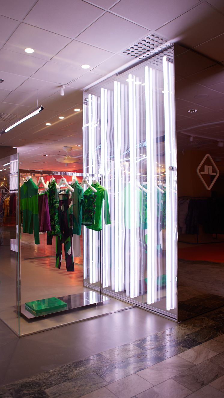 J.Lindebergs kommer erbjuda sportkollektioner för både män och kvinnor: Golf, Ski, Racket, Outdoor, Active och Athleisure. Ledorden för den 156 kvadratmeter stora ytan har varit futuristisk lyx. Materialvalen leker med kontraster, till exempel rå betong intill borstat stål och starka färger.