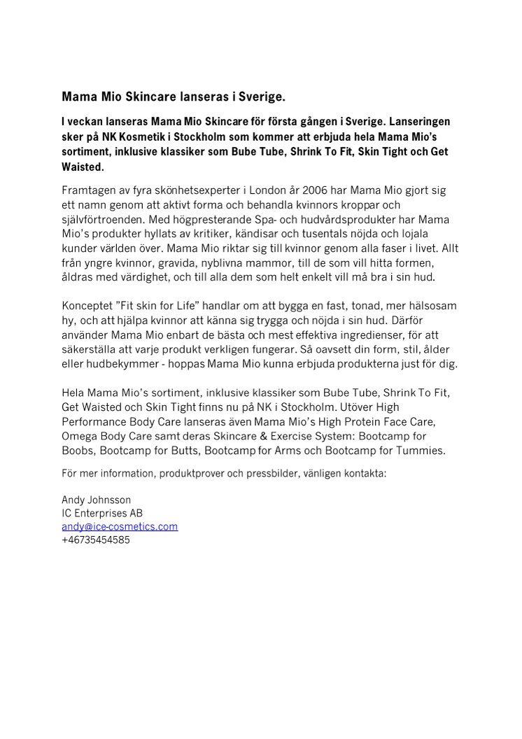 Hela Mama Mio’s sortiment, inklusive klassiker som Bube Tube, Shrink To Fit, Get Waisted och Skin Tight finns nu på NK i Stockholm. Utöver High Performance Body Care lanseras även Mama Mio’s High Protein Face Care, Omega Body Care samt deras Skincare & Exercise System: Bootcamp for Boobs, Bootcamp for Butts, Bootcamp for Arms och Bootcamp for Tummies.