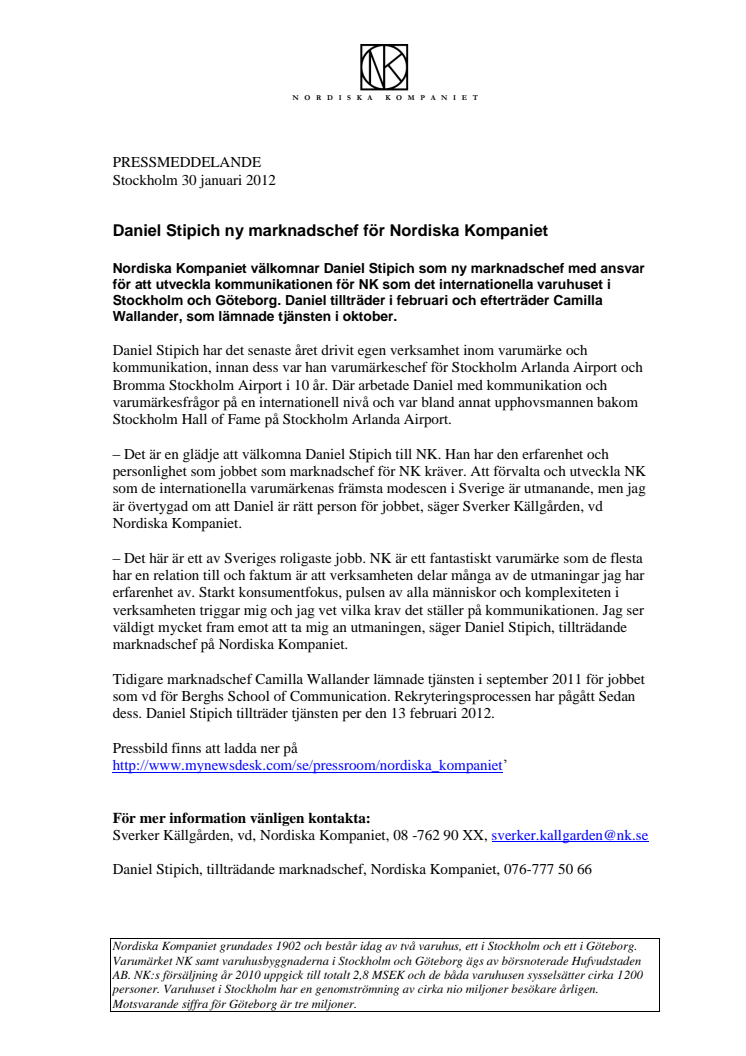 – Det är en glädje att välkomna Daniel Stipich till NK. Han har den erfarenhet och personlighet som jobbet som marknadschef för NK kräver. Att förvalta och utveckla NK som de internationella varumärkenas främsta modescen i Sverige är utmanande, men jag är övertygad om att Daniel är rätt person för jobbet, säger Sverker Källgården, vd Nordiska Kompaniet.
