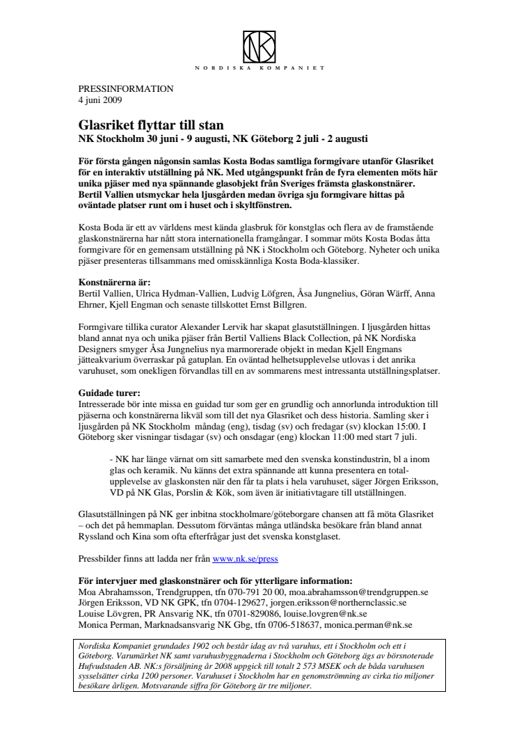 - NK har länge värnat om sitt samarbete med den svenska konstindustrin, bl a inom glas och keramik. Nu känns det extra spännande att kunna presentera en total-upplevelse av glaskonsten när den får ta plats i hela varuhuset, säger Jörgen Eriksson, VD på NK Glas, Porslin & Kök, som även är initiativtagare till utställningen.