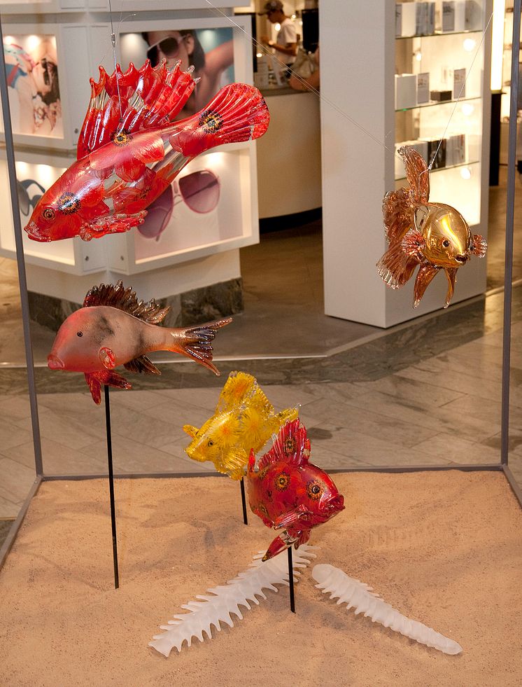 Formgivare tillika curator Alexander Lervik har skapat glasutställningen. I ljusgården hittas bland annat nya och unika pjäser från Bertil Valliens Black Collection, på NK Nordiska Designers smyger Åsa Jungnelius nya marmorerade objekt in medan Kjell Engmans jätteakvarium överraskar på gatuplan. En oväntad helhetsupplevelse utlovas i det anrika varuhuset, som onekligen förvandlas till en av sommarens mest intressanta utställningsplatser.