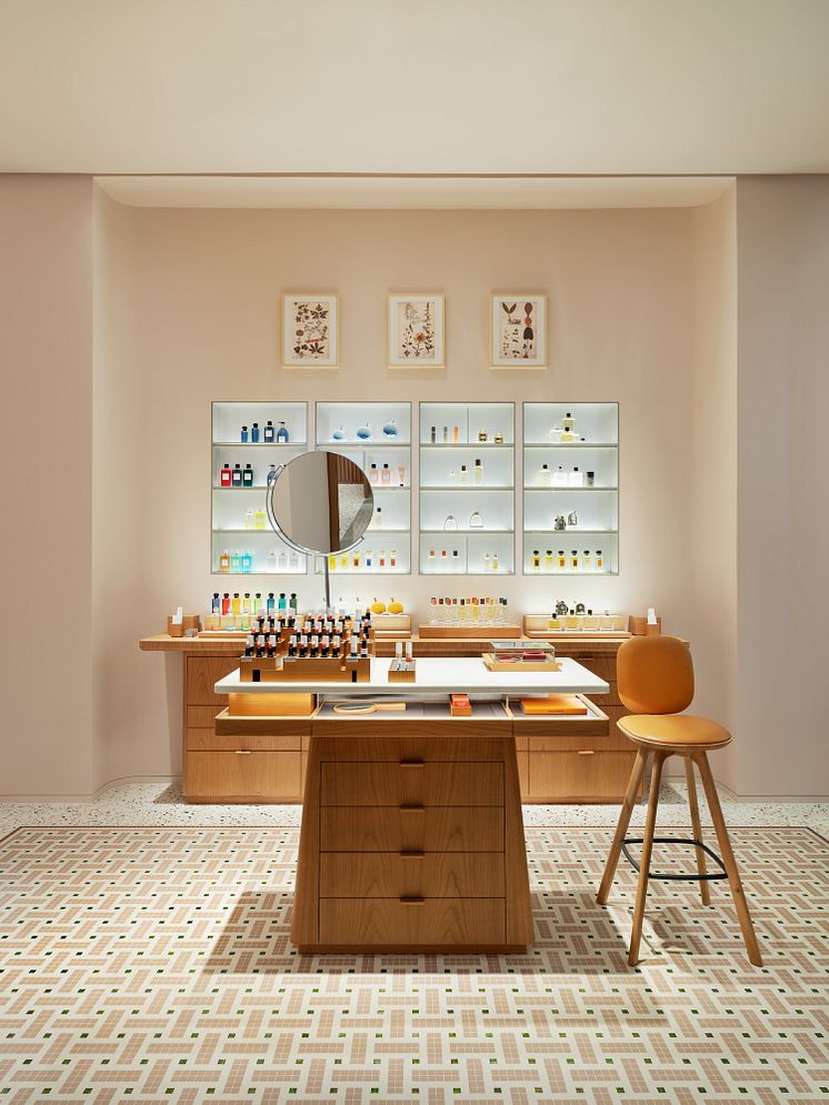 Den andra entrén leder direkt till en avskild och exklusiv skönhetsavdelning inredd i delikata puderrosa toner, ända ned till det karaktäristiska mosaikgolvet. Här erbjuds bland annat den nya och andra kollektionen av Rouge Hermès Limited Edition läppstifthöst-vinter 2020 – en trio rosa nyanser i begränsad upplaga.
