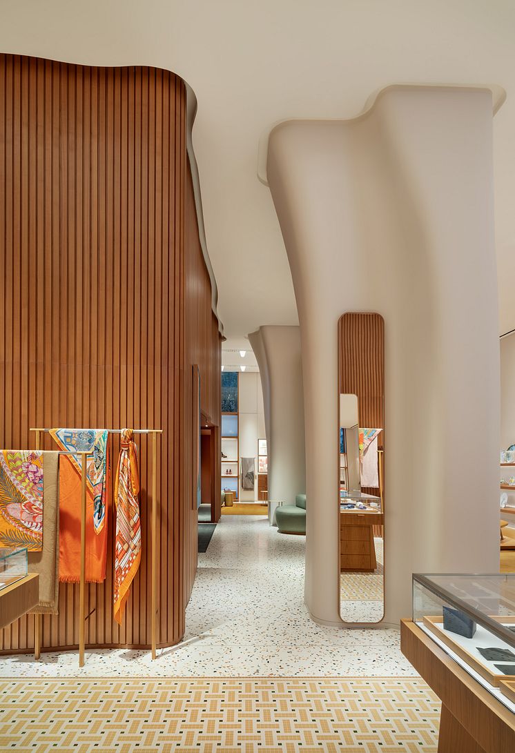 Den Parisbaserade arkitektbyrån RDAI har sett till att Hermès unika arkitekturspråk genomsyrar varje detalj. Terrazzogolven med inslag av olika färgnyanser kontrasteras med lyxiga mattor, medan det 4,2 meter höga taket pryds av Hermès ornamentala belysningslister i var ände av butiken. Golvet vid de båda entréerna är försett med husets välkända exlibris-märke i mattborstat rostfritt stål. Som en blinkning till skandinavisk design har de bärande mittpelarna givits en modernistisk, skulptural form. Accentväggar klädda i böljande körsbärsträ bidrar med extra textur och värme.