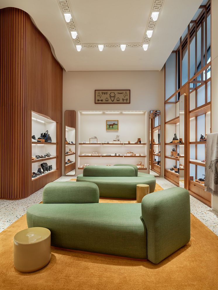 Hermès nya butik vetter mot Hamngatan och har skyltfönster med geometriska karmar i koppar. Butiken har två entréer. Från huvudingångens dubbeldörrar har kunderna en perfekt överblick över den spatiösa lokalen på 216 kvadratmeter. I den öppna planlösningen avlöser husets olika världar varandra sömlöst, från sidenvärlden med sitt vita och okragula mosaikgolv, hämtat från flaggskeppsbutiken i Paris, till smyckesavdelningen på den bortre väggen.