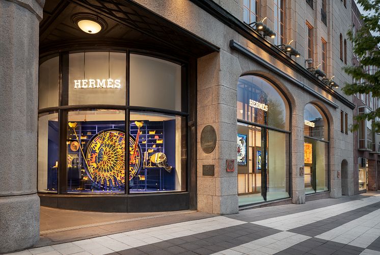 De två fönstervalven mot gatan öppnar upp för spännande, dynamiska skyltningar där Hermès ikoniska sidenramar lyser upp livfulla och färgstarka tryck. Ett tredje hörnfönster är ett blickfång för unika, konstnärliga installationer. Till öppningen har modehuset beställt ett verk av den holländske konstnären Levi van Veluw. Konstnärens färgglada skulptur, en mekanisk snurrande sol, utforskar den romantiska synen på konstnären som hantverkare. Hermès tradition att skapa en unik identitet för varje Hermèsbutik fortsätter i Stockholm med noggrant utvalda konstverk, botaniska tryck och hästkataloger från Emile Hermès samling.