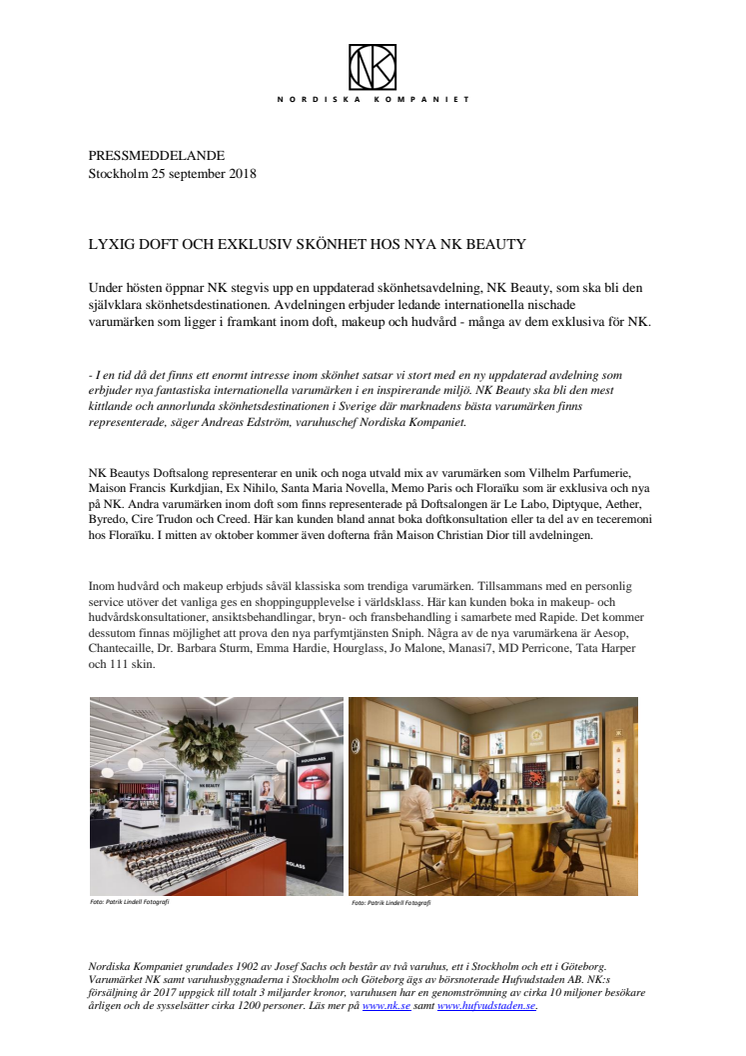 - I en tid då det finns ett enormt intresse inom skönhet satsar vi stort med en ny uppdaterad avdelning som erbjuder nya fantastiska internationella varumärken i en inspirerande miljö. NK Beauty ska bli den mest kittlande och annorlunda skönhetsdestinationen i Sverige där marknadens bästa varumärken finns representerade, säger Andreas Edström, varuhuschef Nordiska Kompaniet.