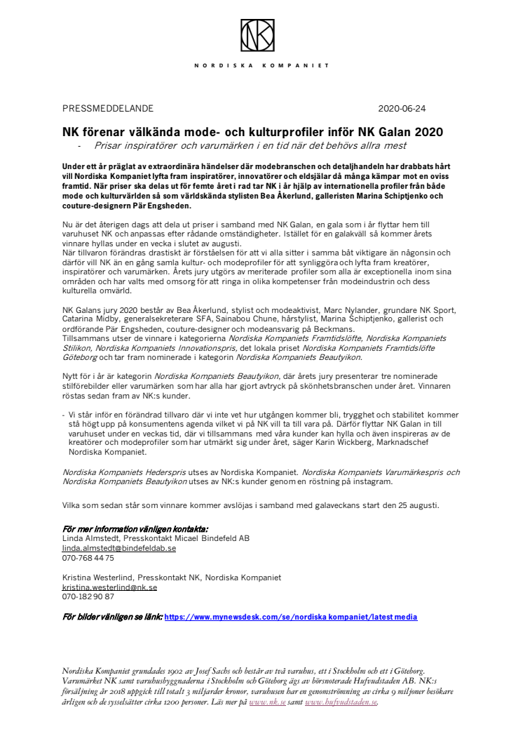 - Vi står inför en förändrad tillvaro där vi inte vet hur utgången kommer bli, trygghet och stabilitet kommer stå högt upp på konsumentens agenda vilket vi på NK vill ta till vara på. Därför flyttar NK Galan in till varuhuset under en veckas tid, där vi tillsammans med våra kunder kan hylla och även inspireras av de kreatörer och modeprofiler som har utmärkt sig under året, säger Karin Wickberg, Marknadschef Nordiska Kompaniet.
