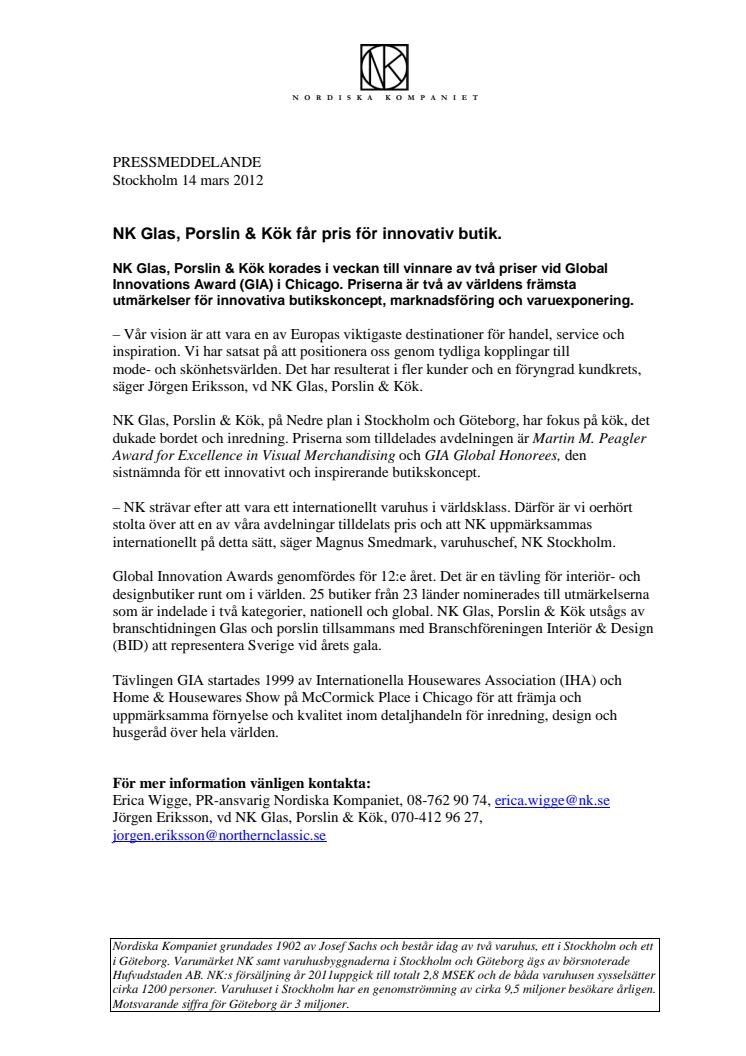 NK Glas, Porslin & Kök korades i veckan till vinnare av två priser vid Global Innovations Award (GIA) i Chicago. Priserna är två av världens främsta utmärkelser för innovativa butikskoncept, marknadsföring och varuexponering.