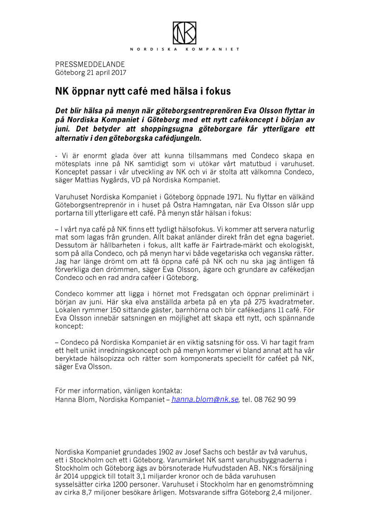 – I vårt nya café på NK finns ett tydligt hälsofokus. Vi kommer att servera naturlig mat som lagas från grunden. Allt bakat anländer direkt från det egna bageriet. Dessutom är hållbarheten i fokus, allt kaffe är Fairtrade-märkt och ekologiskt, som på alla Condeco, och på menyn har vi både vegetariska och veganska rätter. Jag har länge drömt om att få öppna café på NK och nu ska jag äntligen få förverkliga den drömmen, säger Eva Olsson, ägare och grundare av cafékedjan Condeco och en rad andra caféer i Göteborg.