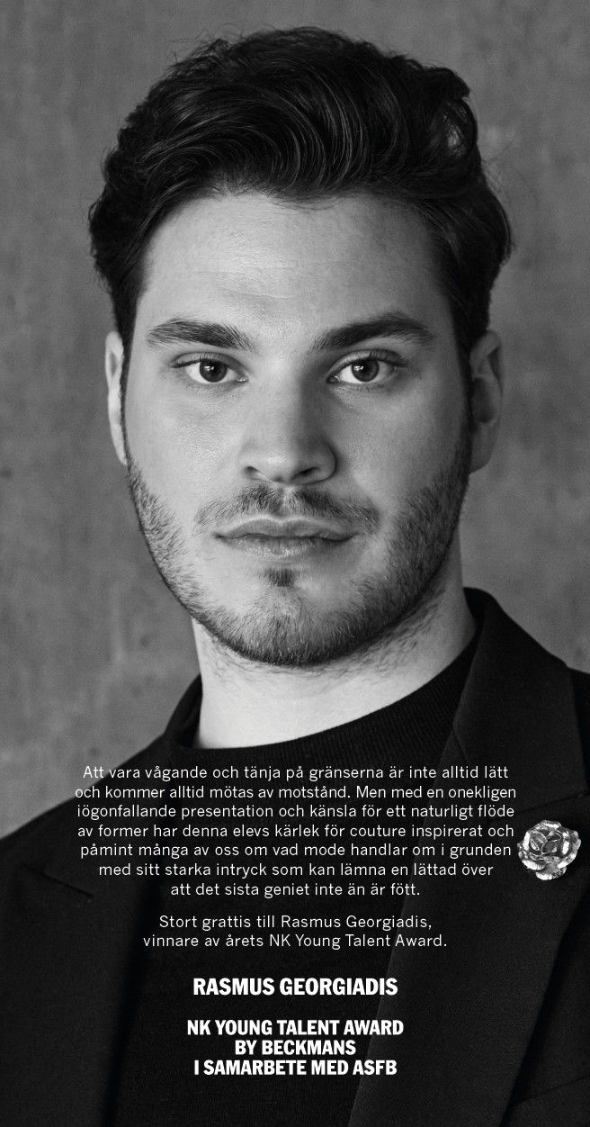 Med NK Young Talent Award by Beckmans fortsätter Nordiska Kompaniet, Beckmans, ASFB och Stockholm Fashion Week att tillsammans bana väg för framtidens kreativa röster inom svenskt mode. Genom att lyfta fram talanger som Rasmus Georgiadis skapas inte bara nya möjligheter för unga designers, utan också en rikare och mer mångfacetterad modescen, där nytänkande, hantverk och vision går hand i hand.