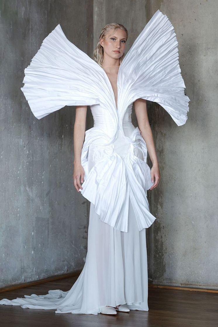 A Flourishing Confluence är en undersökning av just detta förhållande. Med hjälp av avancerade tekniker som laserskärning, 3D-printing, broderier och handplissering, skapas silhuetter som både är tekniskt avancerade och poetiskt laddade. De skulpturala formerna rör sig i gränslandet mellan mode och konst, med naturens organiska strukturer och texturer som ständig referenspunkt. Under sin praktik hos Iris van Herpen i Amsterdam fick Rasmus möjlighet att fördjupa sitt utforskande av mode som konstform. Erfarenheten har påverkat hans arbete på djupet och stärkt hans ambition att skapa design som inte bara är bärbar, utan som också väcker känslor och utmanar det visuella uttrycket.