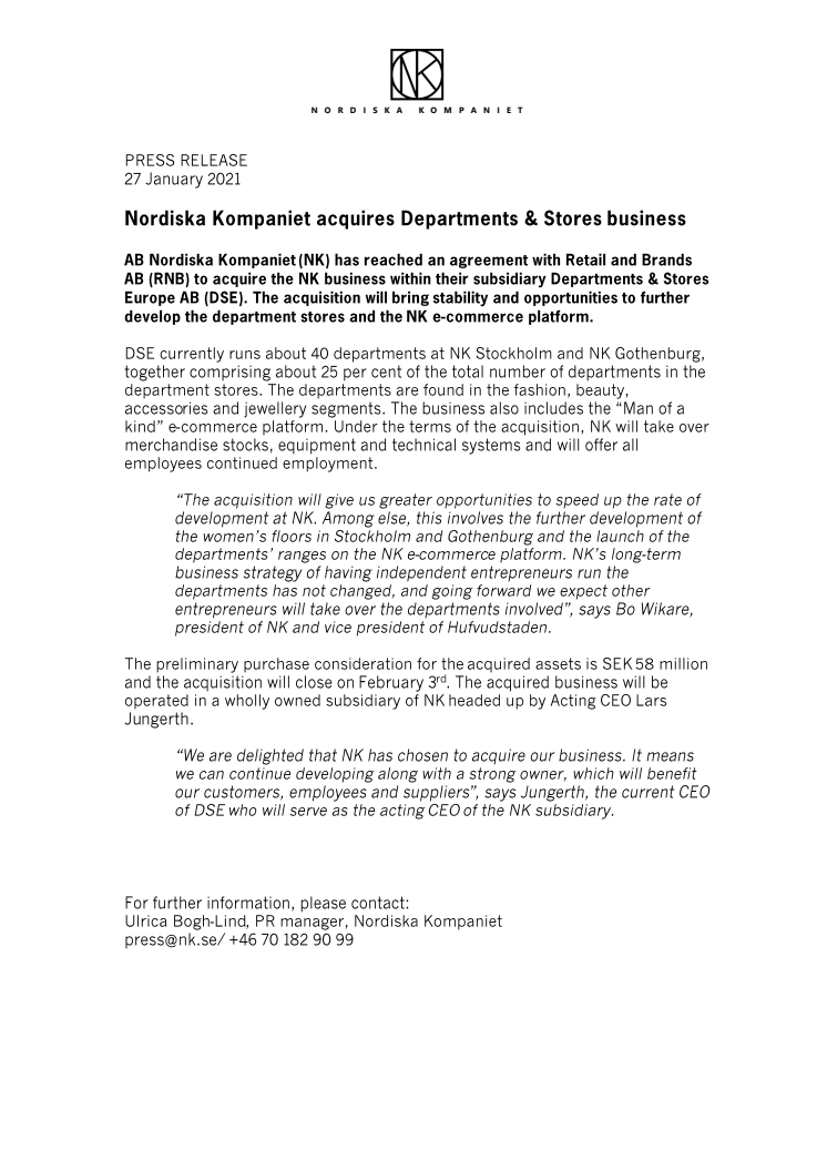 AB Nordiska Kompaniet (NK) har träffat en överenskommelse med Retail and Brands AB (RNB) om att förvärva NK-verksamheten inom deras dotterbolag Departments & Stores Europe AB (DSE). Förvärvet skapar stabilitet och ger utvecklingsmöjligheter för varuhusen och för NK:s e-handel.