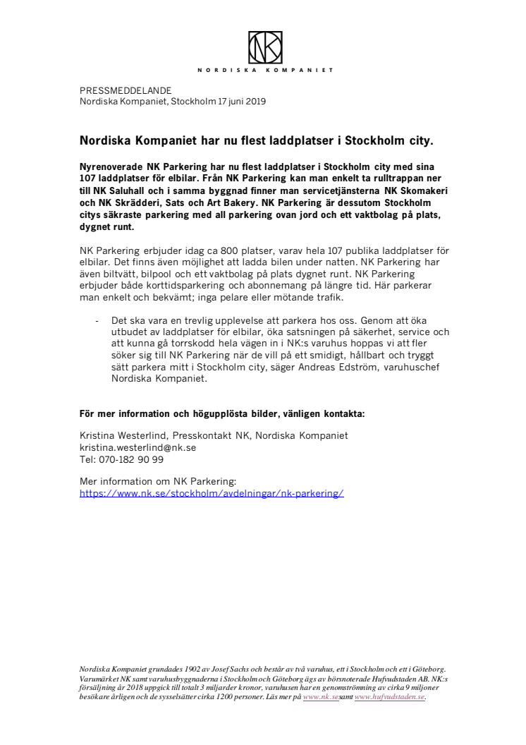 - Det ska vara en trevlig upplevelse att parkera hos oss. Genom att öka utbudet av laddplatser för elbilar, öka satsningen på säkerhet, service och att kunna gå torrskodd hela vägen in i NK:s varuhus hoppas vi att fler söker sig till NK Parkering när de vill på ett smidigt, hållbart och tryggt sätt parkera mitt i Stockholm city, säger Andreas Edström, varuhuschef Nordiska Kompaniet.