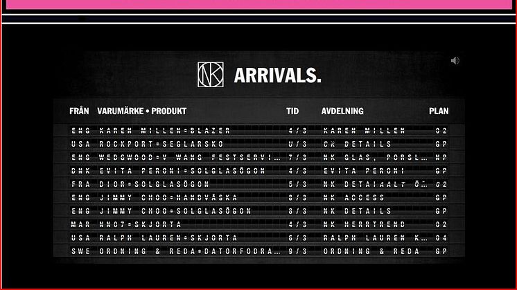 Inne i varuhusen finns en stor digital ankomst tavla, likt informationstavlor som finns på flygplatser för ankommande och avgående flyg. Där visas mängder nya produkter som anländer från världens alla hörn till NK:s olika avdelningar. Runt om i varuhusen kan man också se fraktlådor med olika nyheter och produkter på varje våningsplan. Vi jobbar med fraktspråket som manér både i extern och intern media.
