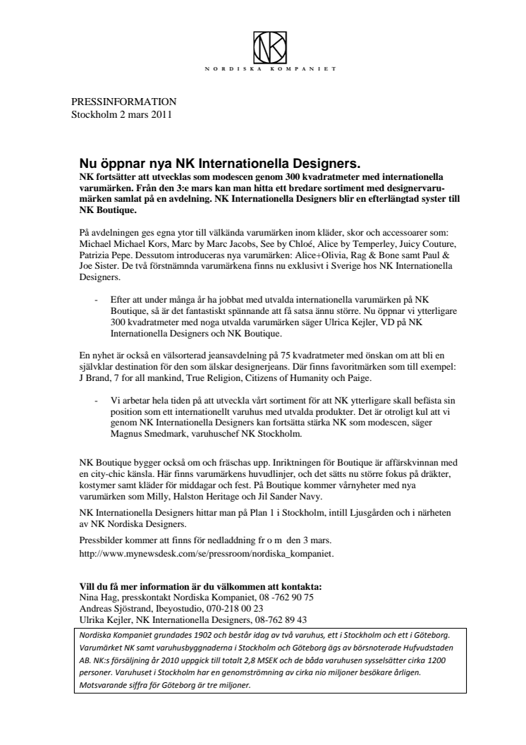 Nina Hag, presskontakt Nordiska Kompaniet, 08 -762 90 75