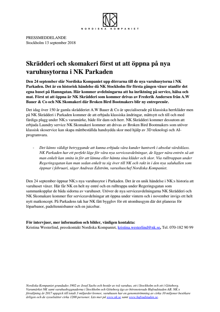 Den 24 september slår Nordiska Kompaniet upp dörrarna till de nya varuhusytorna i NK Parkaden. Det är en historisk händelse då NK Stockholm för första gången växer utanför det egna huset på Hamngatan. Här kommer avdelningarna att ha inriktning på service, hälsa och mat. Först ut att öppna är NK Skrädderi som kommer drivas av Frederik Andersen från A.W Bauer & Co och NK Skomakeri där Broken Bird Bootmakers blir ny entreprenör.