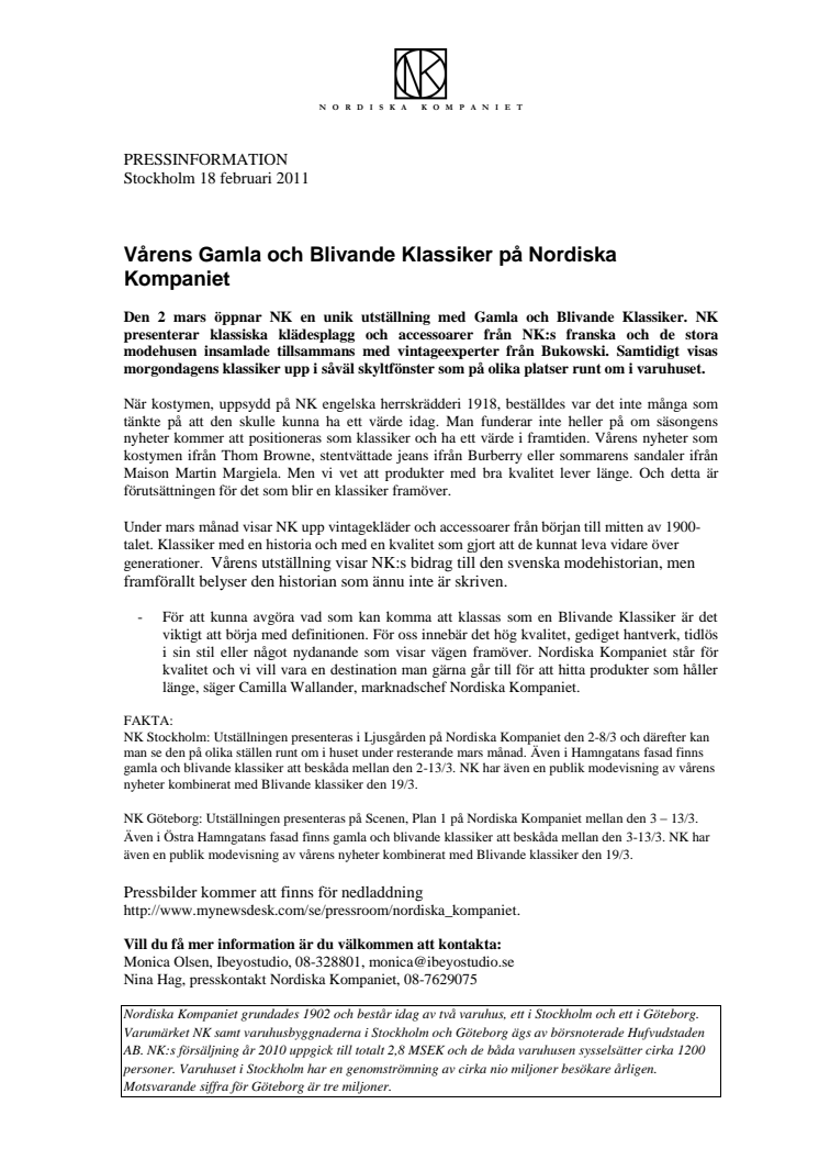 Den 2 mars öppnar NK en unik utställning med Gamla och Blivande Klassiker. NK presenterar klassiska klädesplagg och accessoarer från NK:s franska och de stora modehusen insamlade tillsammans med vintageexperter från Bukowski. Samtidigt visas morgondagens klassiker upp i såväl skyltfönster som på olika platser runt om i varuhuset.